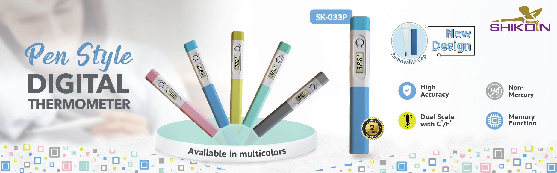 Shikon SK-033P New Pen Style Digital Thermometer is designed to measure the human body temperature in regular mode orally, rectally or under the arm. It provides quick and accurate reading of the body temperature. It is reusable for clinical or home use by people of all age group including children under 8 yrs old with adult supervision. It provides easy measurement of temperature as it shows results in both Fahrenheit & Celsius. The New Pen Style design eliminates the use of Crystal Case thereby protects the tip from external dirt etc. It is medically approved for safe use backed by two years replacement warranty.